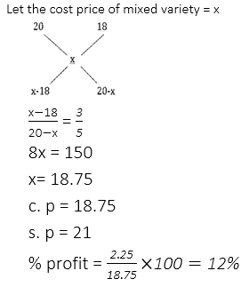 Q8. A producer of rice mixes two varieties of rice from two fields one costing Rs 18 per kg and another Rs 20 per kg in the ratio 5 : 3. If he sells the mixed variety at Rs 21 per kg, then his gain percent is