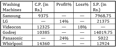 Directions (6-10): A dealer purchased 6 old washing machines of 6 different companies from OLX and sold them in market. Given below is the data showing cost price, selling price and profit/loss percentage.