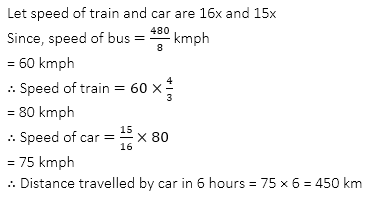 Q19. The ratio between the speed of a train and a car is 16 : 15 respectively. Also a bus covered a distance of 480 kms. In 8 hours. The speed of the bus is three-forth the speed of the train. How much distance will the car cover in 6 hours?