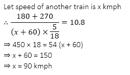 Q18. A 180 metres long train crosses another 270 metres long train running in the opposite direction in 10.8 seconds. If the speed of the first train is 60 kmph, what is the speed of the second train in kmph?