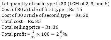 Q13. A shopkeeper bought some pencils at 2 for Rs. 1, and an equal number at 3 for Rs. 2. He sold the entire lot at 5 for Rs. 3. Find out his gain or loss percentage.