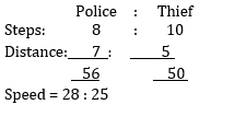 Q12. A policeman starts to chase a thief. When the thief goes 10 steps the policeman moves 8 steps and 5 steps of the policeman are equal to 7 steps of the thief. The ratio of the speeds of the policeman to the thief is: