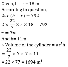 Q13. The sum of the radius and height of a cylinder is 18m. The total surface area of the cylinder is 792 m², what is the volume of the cylinder ? (in m³)