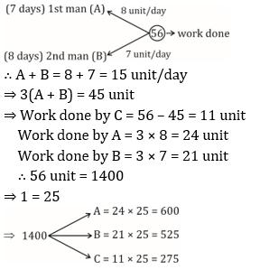 Q14. Two men undertake to do a piece of work for Rs. 1400. The first man alone can do this work in 7 days while the second man alone do this work in 8 days. If they working together complete this work in 3 days with the help of a boy, how should the money be divided?