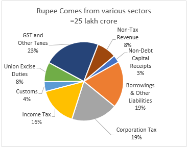 Directions (11-15): The following pie chart show the percentage distribution of data of total sum come from various sectors and percentage distribution of total sum gone to various sector respectively given by the finance minister of India Mr. Arun Jately in his Budget speech of 2018-19.