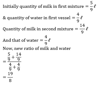 Q15. A vessel contains 1 litre mixture of milk and water and the other vessel contains 2 litre mixture of the same. The ratio of milk and water in first and second vessels is 5 : 4 and 7 : 2 respectively. The mixture of second vessel is poured back to first vessel. Find the ratio of milk and water in the first vessel.
