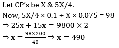 Q14. A person bought two clocks. The cost price of one of them exceeds the cost price of the other by 1/4th. He sold the dearer one at a gain of 10% and the other at a gain of 7.5% and thus got Rs. 98 in all as profit. Find the cost price of the cheaper one.