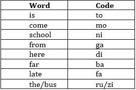 ‘is the bus late’ is written as ‘ru zi fa to’. Q6. What does the code ‘ga’ stand for in the given code language?