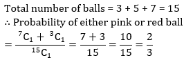Q15. A bag contains 3 red balls, 5 yellow balls and 7 pink balls. If one ball is drawn at random from the bag, what is the probability that it is either pink or red?