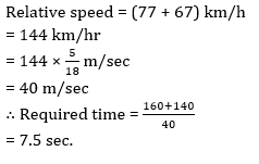 Q11. Two trains one 160 m and the other 140 m long are running in opposite directions on parallel track, the first at 77 km an hour and the other at 67 km an hour. How long will they take to cross each other?