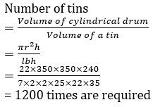 Q12. The diameter of the base of a cylindrical drum is 35 dm and the height is 24 dm. It is full of kerosene. How many tins each of size 25 cm × 22 cm × 35 cm can be filled with kerosene from the drum? (use π=22/7)