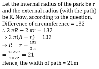 Q13. A path of uniform width surrounds a circular park. The difference of internal and external circumferences of this circular path is 132 m. Its width is (take π=22/7)