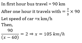 Q14. A bus starts off from a station at 9 A.M at a speed of 90 km/hr. After 1 hour reduces its speed by 33 (1/3)% If person on car sets off from the same station at 10 AM on the same day from which bus started and moves in the direction in which bus is moving then what should be the speed of car so that it overtakes bus at 12 Noon.