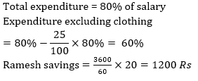 Q12. Ramesh has 20% savings with him from his monthly salary. If expenditure on clothing is 25% of overall expenditure and his total expenditure except clothing is 3600 then find his saving.