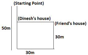 Dinesh who is facing South walked 50 metres before turning to his left to walk 30 metres. From this point, he turned towards North and walked for 30 metres more before reaching his friend’s house. To return to his house he turned left and walked straight 30 metres.