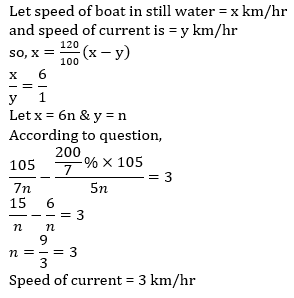 Q11. Speed of a boat in still water is 120% of its upstream speed in a river. After covering 105 km downstream it returns and covers 28 (4/7)% of distance covered in downstream. If time taken in downstream is 3 hours more than time taken in return trip then find the normal speed of current.