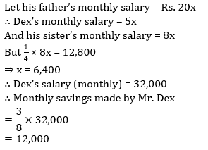 Q12. Monthly salary of Dex is ¼ th of his father’s monthly salary. Dex’s sister’s monthly salary is 2/5th of their father’s monthly salary. Dex’s sister pays Rs 12,800, which is ¼th of her monthly salary as study loan. Savings and expenses made out of the monthly salary by Dex are in the respective ratio of 3 : 5. How much does Dex save each month?