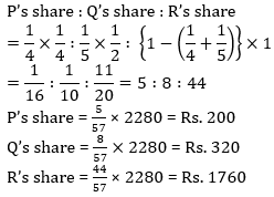 Q12. P, Q and R enter into partnership. P advances one-fourth of the capital for one-fourth of the time. Q contributes one-fifth of the capital for half of the time. R contributes the remaining capital for the whole time. How should they divide a profit of Rs. 2280?