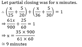 Q11. A cistern can be filled by two taps A and B coming from the same main pipeline in 20 and 30 minutes respectively. Both the taps are opened at the same time but due to partial closing of a valve in the main pipeline tap A was supplying only 4/5th of its capacity and tap B, 5/6th of its capacity. After some time, the valve in the main pipeline was opened fully thereby enabling the two taps to supply at full capacity. It took another 5 minutes to fill the cistern completely. What was the time for which the main pipeline was get partially closed?