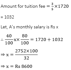 Q15. A gave 40% of his monthly salary to B. B spent 20% of this amount on taxi fare. He spent the remaining amount in the respective ratio of 3 : 5 on tuition fees and library membership. If he spent Rs 1720 for membership, what is A’s monthly salary?