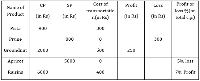Percentage profit or loss for following dry fruits is based on the sum of cost price and transportation cost.