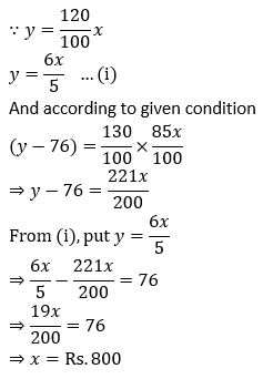 Q13. An item was bought at Rs x and sold at Rs y, there by earning a profit of 20%. Had the value of x been 15% less and the value of y Rs 76 less, a profit of 30% would have been earned. What was the value of x.