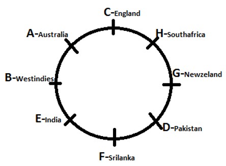 A, B, C, D, E, F, G and H are eight persons who belong to eight different countries viz. Australia, New Zealand, India, Pakistan, Sri Lanka, England, West Indies and South Africa, but not necessarily in the same order. All of them are seated around a circular table and facing towards the center.