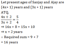 Q11. One year ago the ratio between Sanjay’s and Ajay’s age was 4 : 3. One year hence the ratio of their ages will be 5 : 4. What is the sum of their present ages in year?