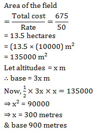 Q15. The base of a triangluar field is three times of its altitude. If the cost of cultivating the field at Rs 50 per hectare be Rs 675, find its base and height. (1 hectare = 10000 m²)