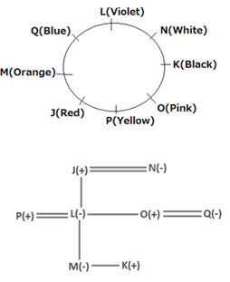 No male like White. Q likes Blue and married to the one who likes Pink. J is the father of L and O, who is a male and likes Pink. J and K cannot sit adjacent to each other. All females sit together. M likes Orange and is sitting second to the left of her father. M is the daughter of L, who is second to the right of her son. The one who likes Violet is married to the one who like Yellow and neither J nor K likes Yellow. N likes White and is sitting between the one who likes Black and the one who like Violet. P is the father of K and is sitting between two male members.