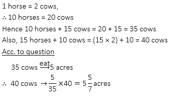 Q15. 10 horses and 15 cows eat grass of 5 acres in a certain time. How many acres will feed 15 horses and 10 cows for the same time, supposing a horse eats as much as 2 cows?