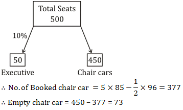Q15. Lucknow bound Shatabdi Express has a capacity of 500 seats of which 10% are in the Executive class and the rest chair cars. During one journey, the train was booked to 85% of its capacity. IF executive class was booked to 96% of its capacity, then how many chair car seats were empty during that journey?