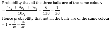 Q11. A bag contains 3 red balls, 4 green balls and 3 yellow balls. Three balls are randomly selected, find the probability that all the three balls are not of the same colour.