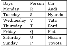 There are seven persons, namely P, Q, R, S, T, U and V. They go to gym by different car namely Audi, Toyota, Tata, Ford, Nissan, Hyundai and Fiat, but not necessarily in the same order, starting from Monday to Sunday (of the same week). T goes to gym on Thursday. Only one person goes to gym between T and the one who goes to gym by Nissan car. P goes to gym immediately after the one who goes to gym by Nissan car. Only three people go to gym between P and the one who goes to gym by Tata car. Only two people go to gym between the one who goes to gym by Tata car and U. The person, who goes to gym by Fiat car, goes to gym before U, but after Thursday. More than two people go to gym between the one who goes to gym by Fiat car and R. The one who goes to gym by Audi car goes to gym immediately before the one who goes to gym by Hyundai car. The one who goes to gym by Ford car goes to gym immediately before Q. V does not go to gym on Tuesday.