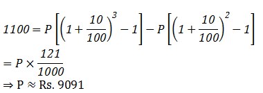 Q11. Anuj has deposited certain amount in the bank to earn compound interest at 10% per annum. The difference in the interest on the amount between the 3rd and 2nd years is Rs. 1,100. What amount has Anujdeposited ?