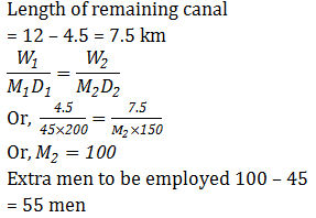 Q12. A contractor start the work of digging a canal 12 km long to be completed in 350 days and employs 45 men. After 200 days he found that only 4.5 km of canal has been completed. Find the number of extra men he must employ to finish the work in time.