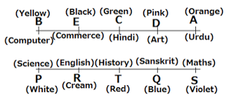 Ten students are sitting in two parallel rows containing five persons each. In row 1, A, B, C, D and E are sitting and all of them are facing south. In row 2, P, Q, R, S and T are sitting and all of them are facing north. In the given seating arrangement, each member seated in a row faces another member of the other row. Moreover, each of them likes different colour viz. yellow, black, green, pink, orange, white, cream, red, blue and violet. Each of them also likes different subject viz. Computer, Urdu, Art, Hindi, Commerce, Science, English, History, Sanskrit and Maths. The following information is known about them.