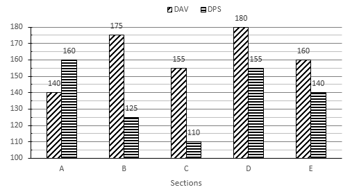 Directions (16-20): The following bar graph shows the total no. of students in 5 sections of class 12 students from two schools DAV and DPS.