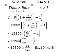 Q16. Simple interest on a certain sum at 7 % p.a. for 4 years is Rs. 3584. What will be the compound interest on the same principal at 4 % p.a. in two years?