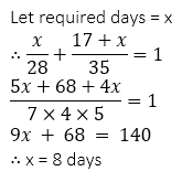 Q19. A and B can do a piece of work in 28 and 35 days respectively. They began to work together but A leaves after sometimes and B completed remaining work in 17 days. After how many days did A leave?