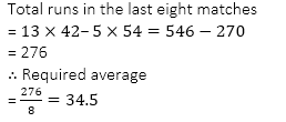 Q17. Average score of a cricketer in 13 matches is 42 runs. If the average score in the first 5 matches be 54 runs, what is the average score in the last eight matches?