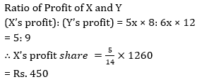 Q14. Two persons X and Y enter into a business by investing their sum in the ratio of 5 : 6. After 8 months, X leaves the business. After a year, if total profit is Rs. 1260, what is the profit of X?