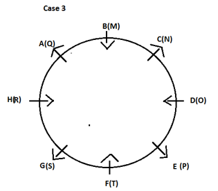 Eight persons – A, B, C, D, E, F, G and H are sitting around a circular table, not necessarily in the same order. Four of them are facing inside and others are facing outside. They belong to eight different cities i.e. M, N, O, P, Q, R, S and T but not necessarily in the same order.