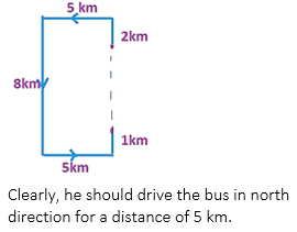 Q1. A school driver drives school bus in north direction for a distance of 2km. Then he turns the bus left side and drives 5km straight. Then he turns bus in left side twice for a distance of 8km and 5km respectively. At last once more he took left turn and go for a distance of 1 km. How far is he from the starting point and in which direction he should drive for reaching starting point?