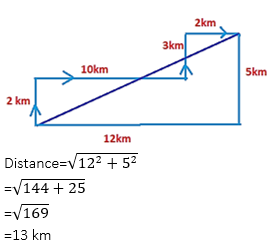 Q2. A man travels 2 km to the north and turns east and travels 10 km and again he turns north and travels 3 km and again turns to east and travels 2 km. How far is he from the starting point?