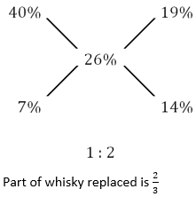 Q1. A jar full of whisky contains 40% alcohol. A part of this whisky is replaced by another containing 19% alcohol and now the percentage of alcohol was found to be 26%. The part of whisky replaced is: