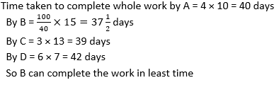 Q3. A can complete 1/4 of a work in 10 days, B can complete 40% of the work in 15 days, C completes 1/3 of the work in 13 days and D 1/6 of work in 7 days. Who will be able to complete work fastest?