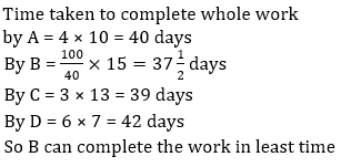 Q14. A can complete 1/4 of a work in 10 days, B can complete 40% of the work in 15 days, C completes 1/3 of the work in 13 days and D 1/6 of work in 7 days. Who will be able to complete work fastest?