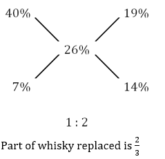 Q12. A jar full of whisky contains 40% alcohol. A part of this whisky is replaced by another containing 19% alcohol and now the percentage of alcohol was found to be 26%. The quantity of whisky replaced is: