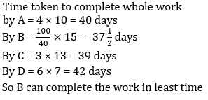 Q4. A can complete 1/4 of a work in 10 days, B can complete 40% of the work in 15 days, C completes 1/3 of the work in 13 days and D 1/6 of work in 7 days. Who will be able to complete work fastest?